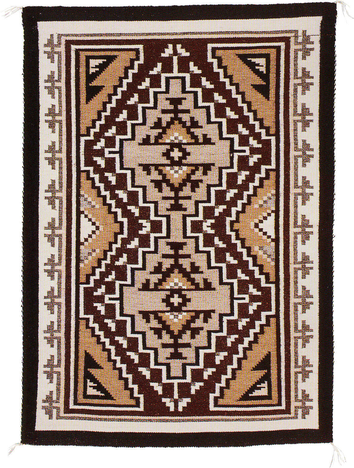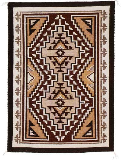 True Two Grey Hills rugs are woven of natural, undyed, handspun wool in designs of white, black, and brown. Weavers produce subtle shades of these